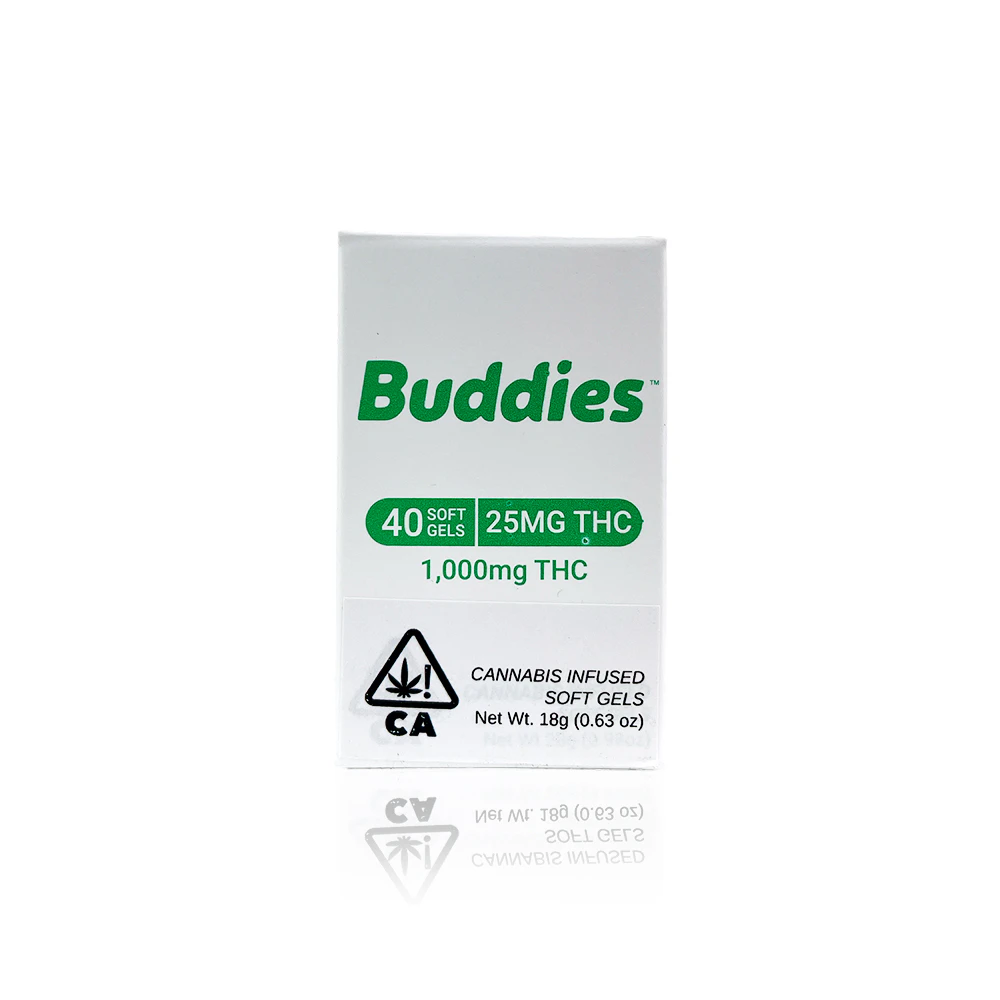 Immerse yourself in the ultimate cannabis experience with BUDDIES - THC Soft Gel Capsules. Each bottle contains an impressive 40-count of soft gels, each delivering a powerful dose of 25mg of THC. That's a total of 1000mg THC, ready to elevate your mind and body to new heights. What sets BUDDIES apart is its discrete, flavorless, and odorless design, coupled with award-winning distillate infused to offer a high-potency effect.
