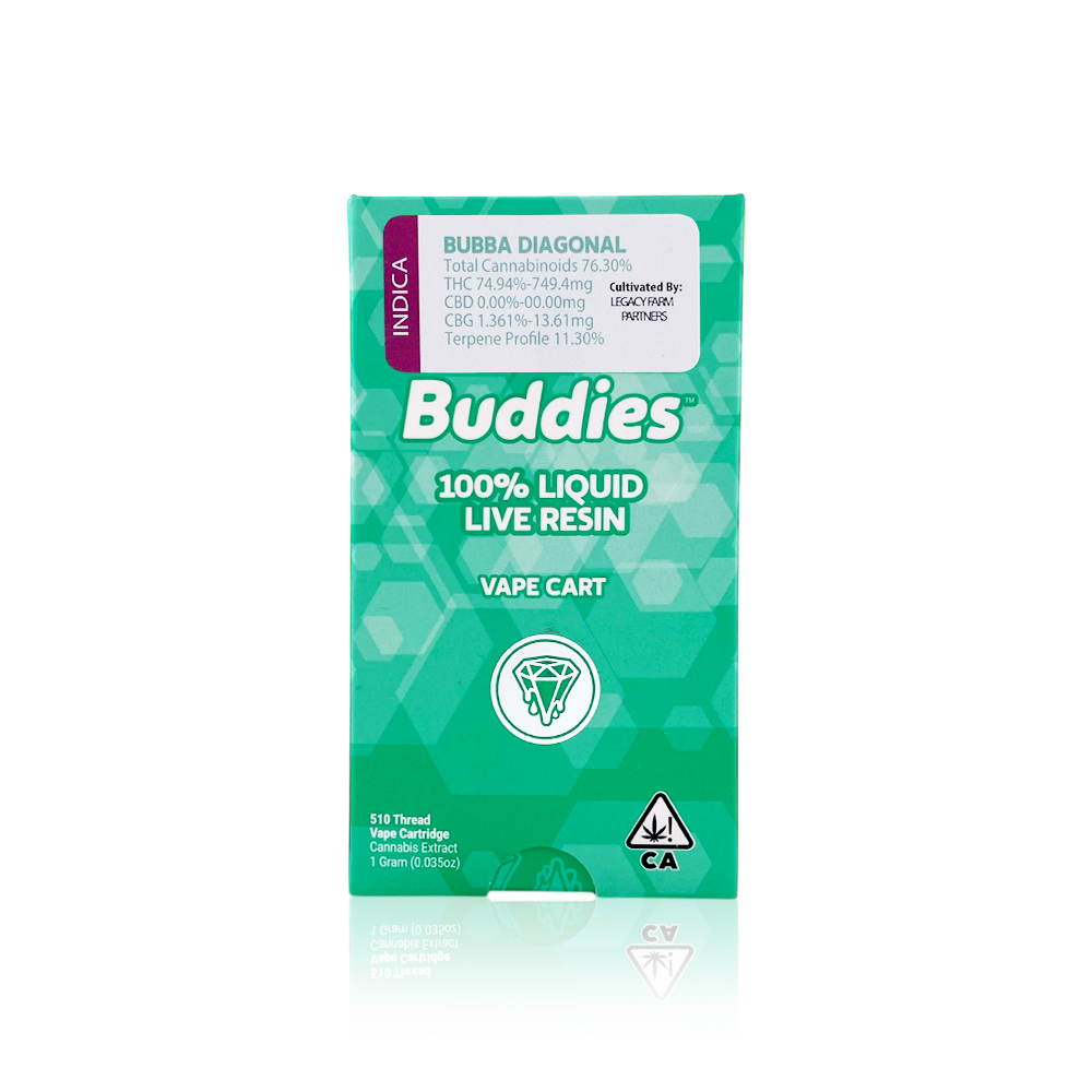 Experience the exceptional flavor and potency of BUDDIES Live Resin Vape Pen featuring the sought-after Bubba Diagonal strain, available at Tropicanna Dispensary's Santa Ana location and through their reliable delivery service across Orange County. This premium 1-gram cartridge captures the authentic essence of fresh-frozen cannabis, preserving the plant's natural terpene profile and delivering a truly authentic experience.