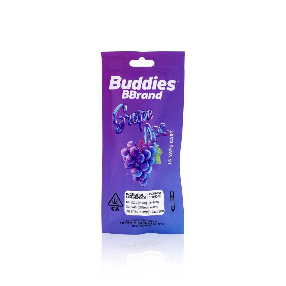 Indulge in the luxurious flavor of BUDDIES - Cartridge - Grape Ape, a premium 1G vape pen that delivers a harmonious blend of grape, berry, and earthy notes. This BBrand creation is crafted with THC distillate and infused with organic botanical terpenes, ensuring a pure and potent experience. Perfect for cannabis connoisseurs seeking a fruit-forward vaping adventure, this cartridge offers a smooth and flavorful hit every time.