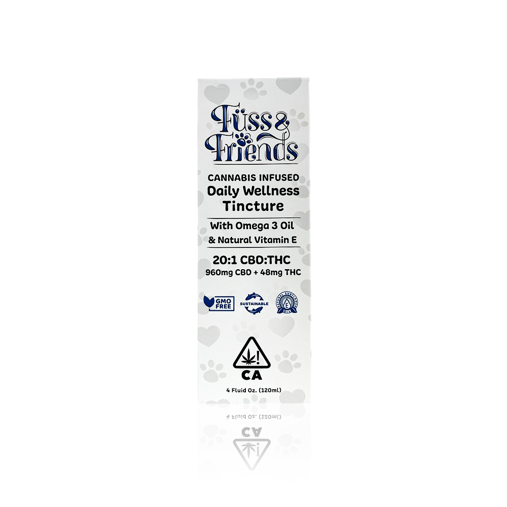 Füss & Friends Daily Wellness Tincture comes in a specially formulated 20:1 CBD:THC ratio designed for furry friends. The Large Friends formula is for our furry friends weighing 70-100 pounds and commonly used for multi-pet homes. This 4oz bottle contains 960mg CBD and 48mg THC infused into an ocean friendly, wild caught toxin free Omega 3 oil. Large friends tincture will last approximately 3-5 weeks for your furry friend weighing 70-100 pounds when given 2x per day. Potential Benefits Of Cannabis For Pets: Anti-inflammatory (i.e. hypersensitivity, dermatitis), Reduction in pain, Reduction in seizures and convulsions, Immune system support (i.e. autoimmune disease, cancer), Nervous system support, Cardiovascular system support , Reduction in anxiety, Gastrointestinal support