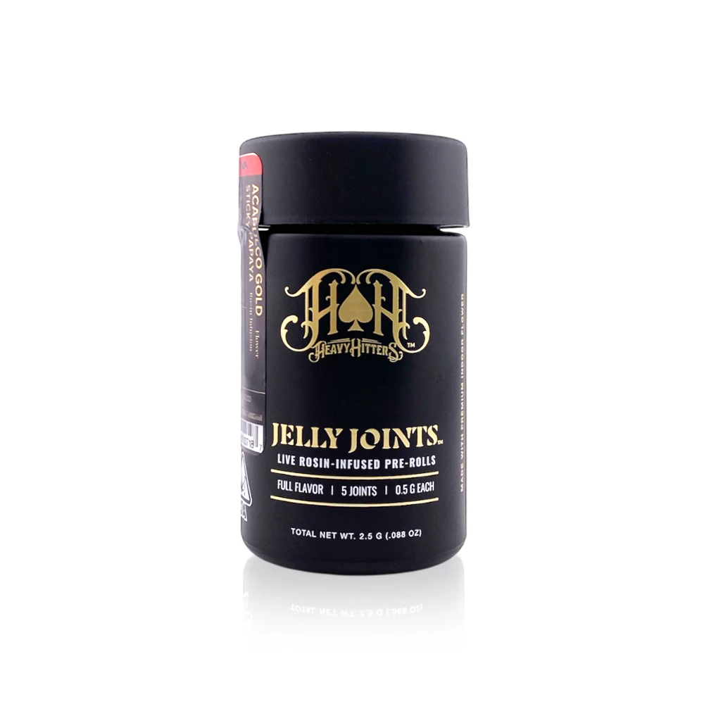 Experience the perfect fusion of legendary strains with Heavy Hitters' premium 5-pack infused prerolls, featuring the iconic Acapulco Gold crossed with Sticky Papaya, enhanced with luxurious rosin jelly. Each pack contains 2.5G of expertly crafted cannabis, precision-rolled to ensure a smooth, consistent burn from start to finish.