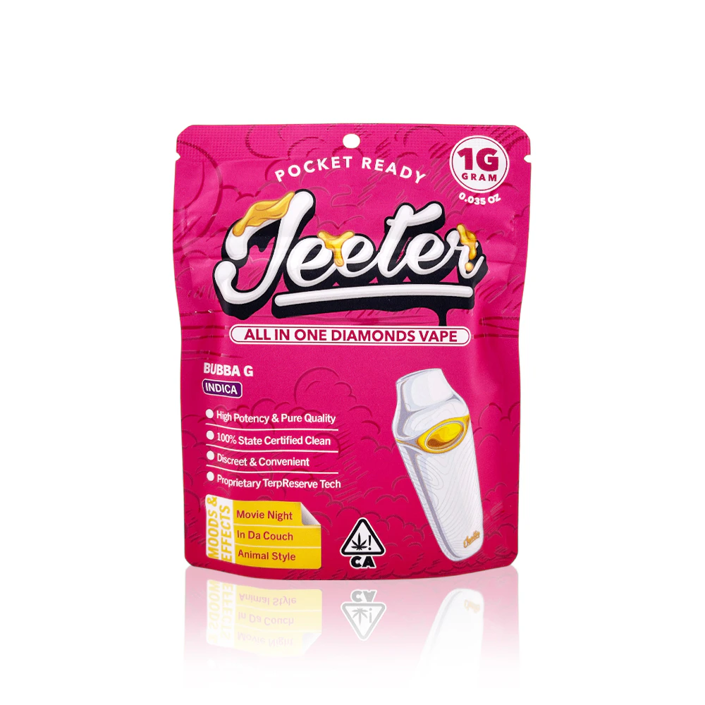 Experience premium cannabis convenience with the JEETER All In One Bubba G 1G vape device, available at Tropicanna Dispensary's Santa Ana storefront and through our reliable weed delivery service. This expertly crafted all-in-one vaporizer features the legendary Bubba G strain, delivering a smooth, potent experience that cannabis enthusiasts across Orange County have come to love.