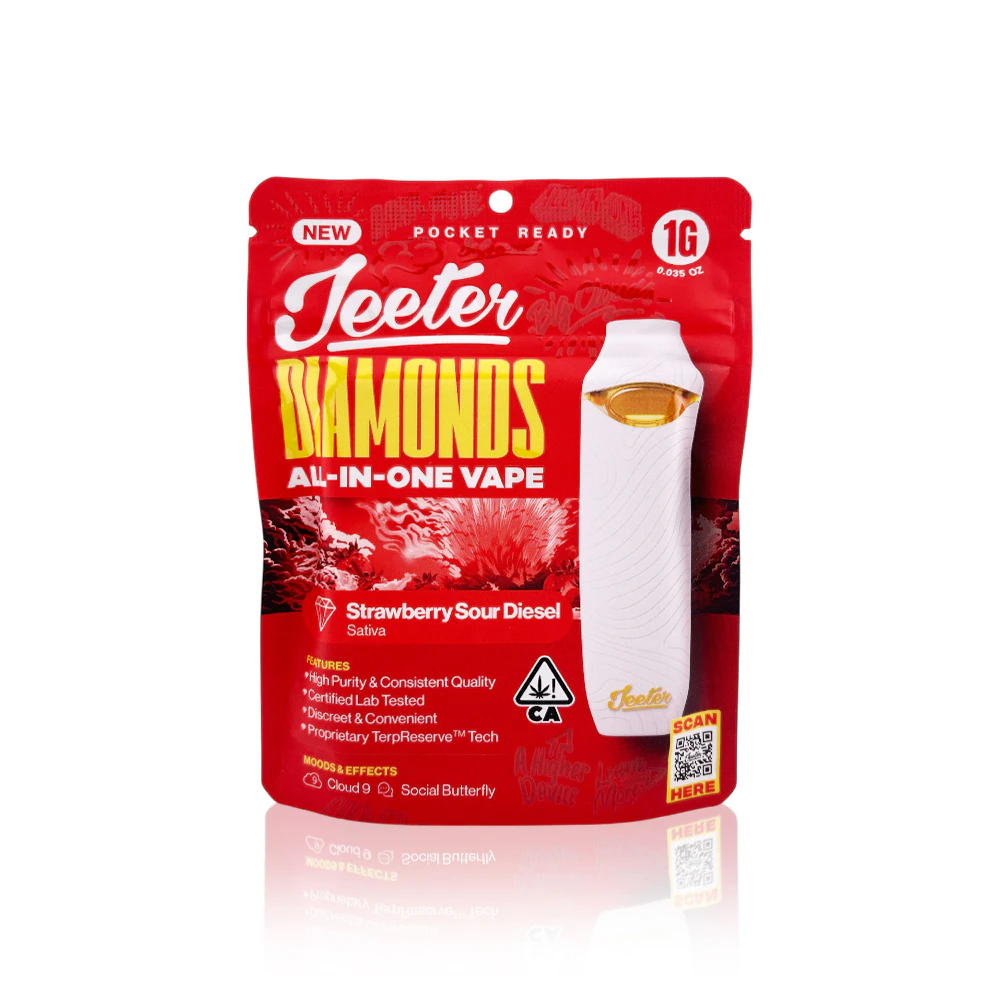Experience premium cannabis convenience with the JEETER All In One Strawberry Sour Diesel 1G vape pen, now available at Tropicanna Dispensary & Weed Delivery. This exceptional hybrid strain combines the sweet, fruity notes of fresh strawberries with the energizing diesel undertones that made Sour Diesel legendary. The result is a perfectly balanced smoking experience that delivers both uplifting cerebral effects and smooth, flavorful vapor.