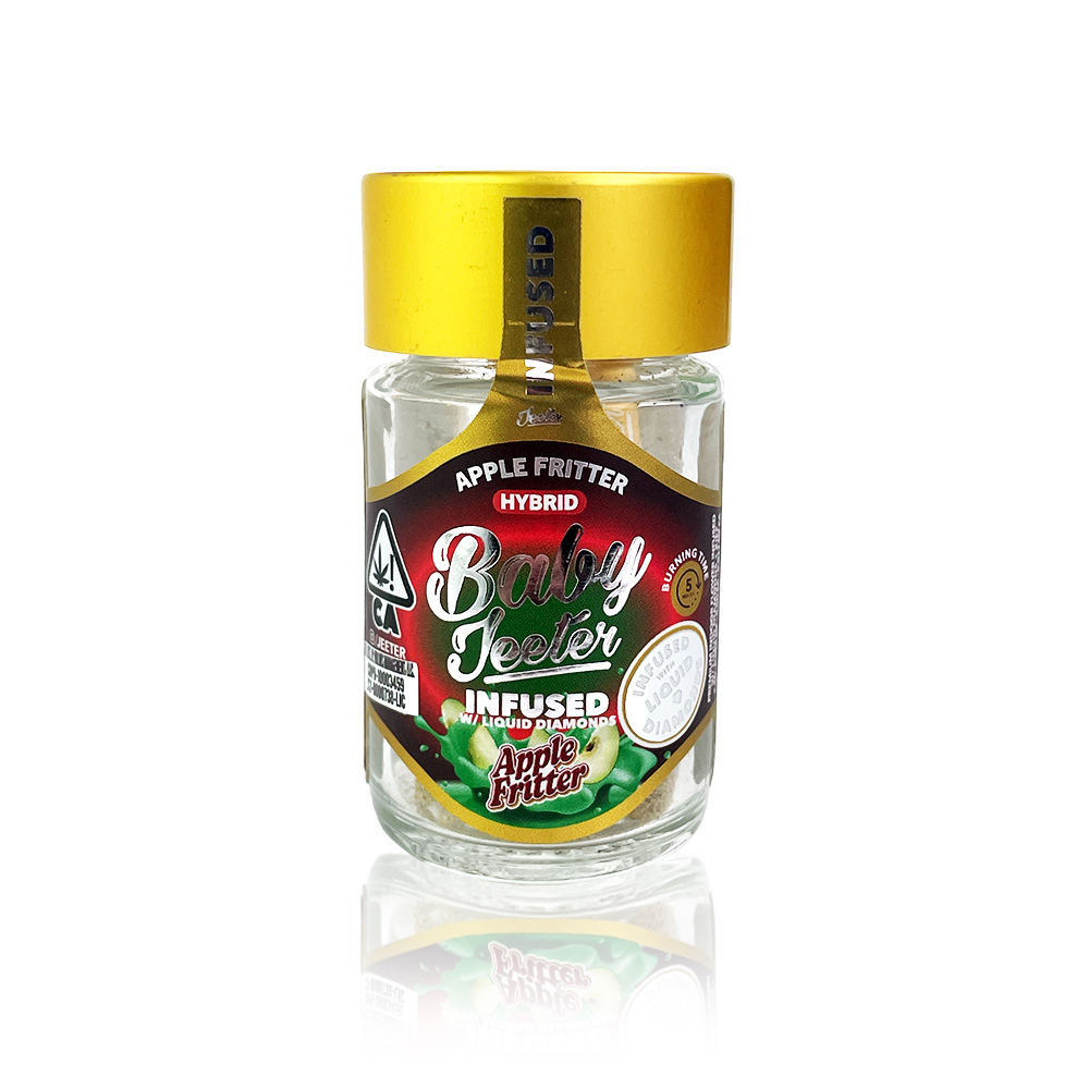 Pocket-sized vibes. Our 5-pack of Baby Jeeters is great for sharing with friends...or not. We won't judge! In each jar, you'll find hand crafted, hand rolled 5 0.5-gram Jeeter joints. They're made with premium indoor grown flower, infused with Liquid Diamonds in California and Michigan or distillate oil in Arizona, and dusted in kief. 5-minute burn time each. Apple Fritter is an evenly balanced hybrid strain created by crossing Sour Apple and Animal Cookies. Its mouthwatering, super sweet fruity apple flavor and lightly cakey vanilla exhale will leave you begging for more after your first hit. The aroma is similar, with an herbal effect as well. This strain's high starts almost immediately, lifting your mind, relaxing your aching muscles, and leaving you completely at ease. Apple Fritter may help relieve chronic pain, depression, insomnia, mood swings and stress.