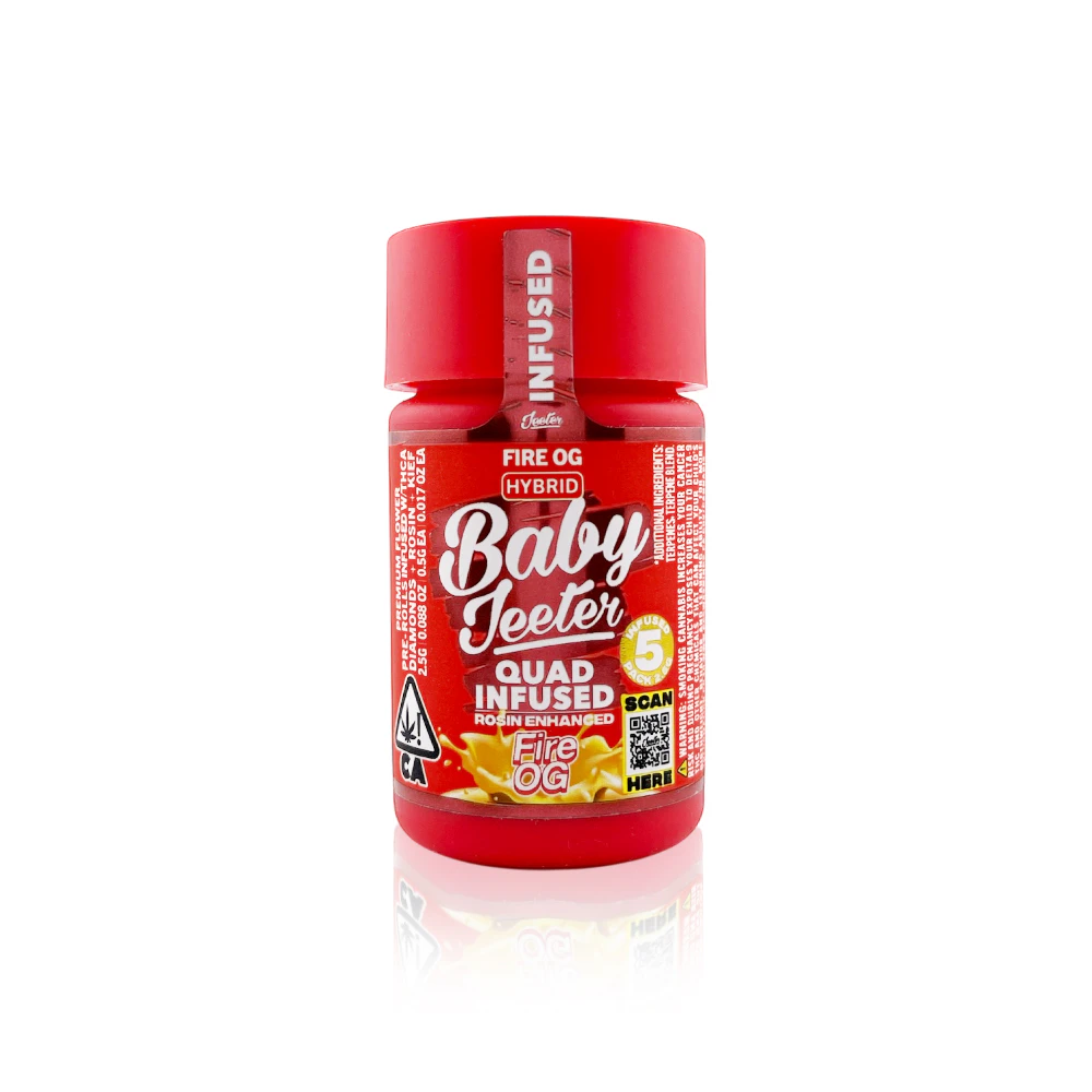Brace yourself for an unparalleled cannabis experience with the BABY JEETER - Infused Preroll - Fire OG - 5-Pack - 2.5G from Tropicanna Dispensary & Weed Delivery. This exquisite offering features five meticulously crafted 0.50g joints, infused with distillate oil and kief, promising a total of 2.5 grams of pure, unadulterated pleasure.