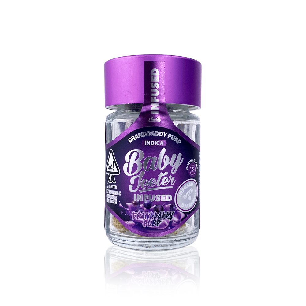 Pocket-sized vibes. Our 5-pack of Baby Jeeters is great for sharing with friends...or not. We won't judge! In each jar, you'll find hand crafted, hand rolled 5 0.5-gram Jeeter joints. They're made with premium indoor grown flower, infused with Liquid Diamonds in California and Michigan or distillate oil in Arizona, and dusted in kief. 5-minute burn time each. Granddaddy Purp is an indica strain that crosses Mendocino Purps, Skunk, and Afghani. As one might expect, its dense, compact buds are wreathed in deep purple leaves which darken as Granddaddy Purp reaches full maturation. It is named for its distinct, sweet grape-like aroma and flavor profile with a slight, spicy earth accent that carries over from its Afghani lineage. This complex cultivar's effect profile provides a carefree relaxation that has been reported to help soothe pain, stress, and anxiety.