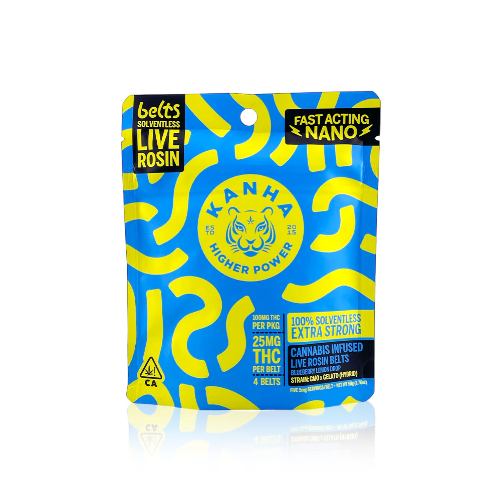 Feel the perfect balance with our NANO Blueberry Lemon Drop Belts, a vibrant Hybrid mix designed for the harmony hunters. Formulated with GMO Cookies and Gelato solventless live rosin for a comforting, mood-boosting journey. These artisanal gummies combine the sweet, juicy essence of fresh blueberries with zesty lemon, creating a perfectly balanced taste sensation. Made using KANHA's innovative solventless extraction process, these belts deliver a pure, clean experience that preserves the full spectrum of natural terpenes and cannabinoids.