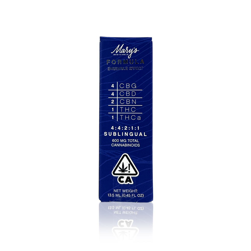 The whole is greater than the sum of its parts. Mary’s FORMULA Sublingual Oil combines 5 different cannabinoids and 6 different terpenes specifically chosen by our team of scientists to maximize wellness through sublingual delivery. Vegan and sugar-free, our FORMULA Sublingual Oil offers long-lasting benefits through balancing your body’s Endocannabinoid System. 4:4:2:1:1 (200mg CBD:200mg CBG:100mg CBN:50mg THC:50mg THCa)Onset: 15 minutes Duration: 3 – 5 hours