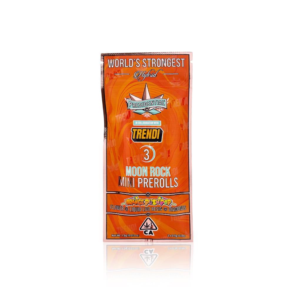Experience the ultimate in premium cannabis luxury with PRESIDENTIAL Orange Push Pop Moon Rock Joints from Tropicanna Dispensary & Weed Delivery. This exceptional 3-pack delivers 1.5 grams of carefully crafted infused prerolls that redefine your smoking experience.