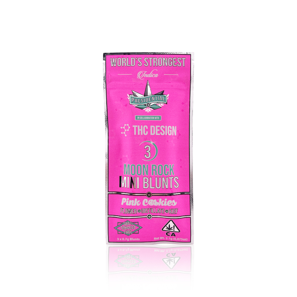 Experience the ultimate in premium cannabis luxury with PRESIDENTIAL Infused Preroll Pink Cookies Mini Moon Rock Blunts. This exceptional 3-pack delivers 2.1 grams of expertly crafted cannabis that redefines your smoking experience. Each mini moon rock blunt combines the beloved Pink Cookies strain with premium cannabis flower, hash oil, and kief coating for an intensely potent and flavorful session.