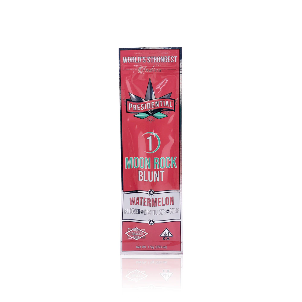 Experience a whole new level of sophistication with the PRESIDENTIAL - Infused Preroll, Watermelon-flavored Moon Rock Blunt. This 1.5G delight from Tropicanna Dispensary & Weed Delivery sets the standard in high-quality cannabis products. It masterfully infuses Top-Shelf Organic Flower with Premium THC Distillate, creating a unique blend that will satisfy the most discerning tastes. But the innovation doesn't stop there. The flower undergoes an innovative proprietary infusion process that permeates all the way to the stem, ensuring a consistent and reliable dose with every use.