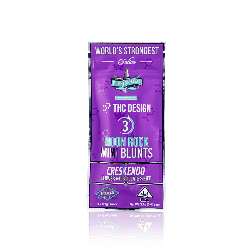 Experience pure luxury with PRESIDENTIAL X THC DESIGN's Crescendo Mini Moon Rock Blunts, available at Tropicanna's Santa Ana storefront and through our reliable delivery service across Orange County. This premium 3-pack of infused prerolls, totaling 2.1G, combines top-shelf flower with concentrated THC for an elevated smoking experience.