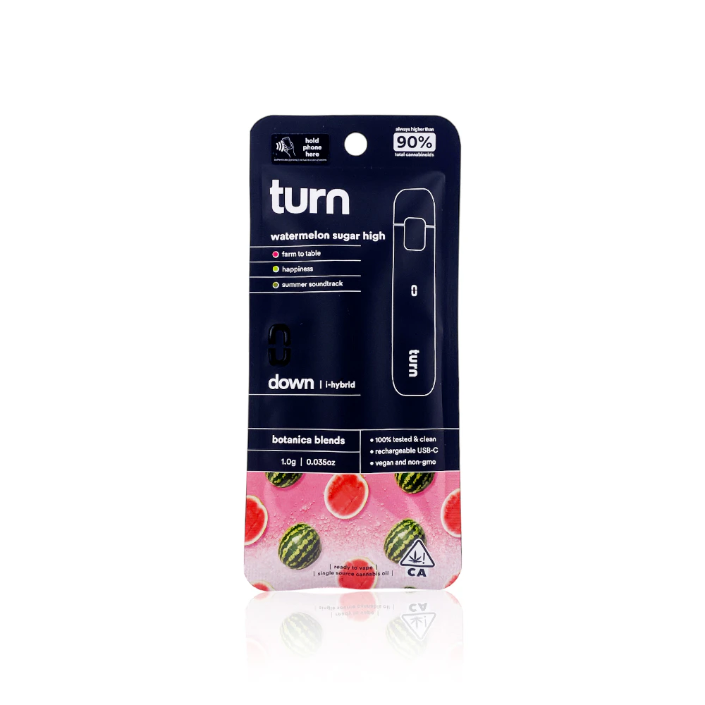 Experience pure bliss with TURN's Watermelon Sugar High All In One, a premium 1-gram vape pen delivering the perfect balance of flavor and potency. This carefully crafted device combines the refreshing sweetness of sun-ripened watermelon with a euphoric high that'll have you floating on cloud nine. Available exclusively at Tropicanna Dispensary's Santa Ana storefront and through their convenient delivery service across Orange County.