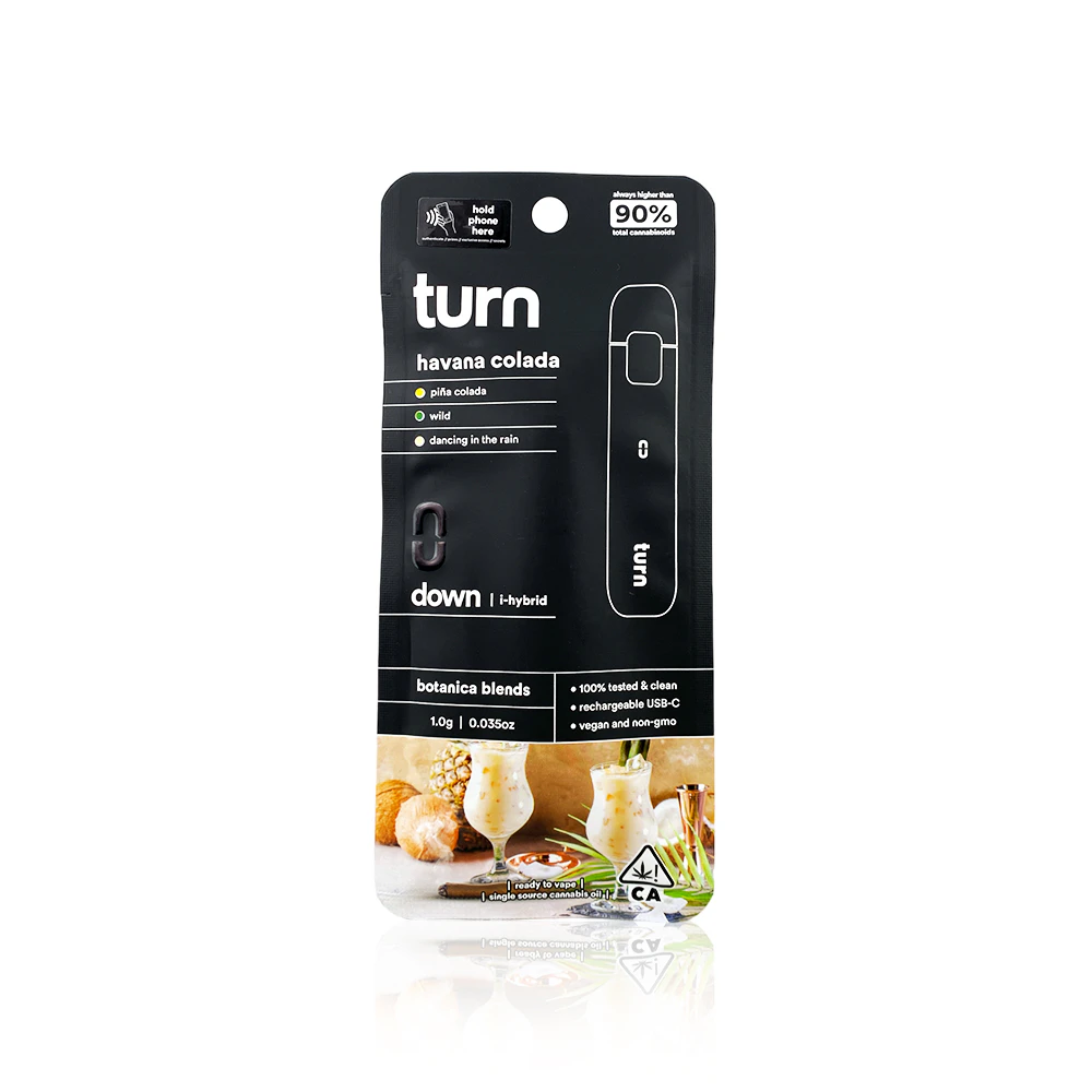 Pack your seersucker shorts; we’re heading to warm shores! Sweet, creamy coconut and a dash of pineapple take taste buds to a tropical paradise alongside a similarly dreamy aroma with the flavor of Havana's uninhibited nightlife. Expect energizing effects ideal for exploring a foreign city. If you like piña coladas… turnpen disposables pack a big punch. With abundant clouds, consistent pulls, and 100% live window view, this pen is practically perfect in every way. No cotton, glue, or heavy metals - ever. You'll only get clean, fresh, guaranteed pure California goodness from seed to pen. Choose from a wide selection of our high potency, exclusive, hand-curated botanica blend formulations to get the perfect floaty feeling you're looking for.