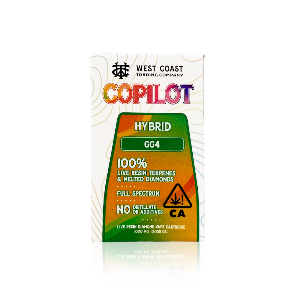 Copilot Live Resin Diamond Vape Cartridges are 100% Cannabis, made from high terpene extracts and liquified diamonds — no additives and distillate free. These cartridges are high in THC (90%+) and contain all the natural aromas, flavors, and terpenes of the high-quality source flower from which they are extracted. They are a full gram of unmatched flavor and potency. GG4 is a balanced hybrid strain crossed between Chem’s Sister, Sour Dubb and Chocolate Diesel. This cart has an earthy, sour and pine flavor profile. GG4 offers relaxing, euphoria great for any time of the day!